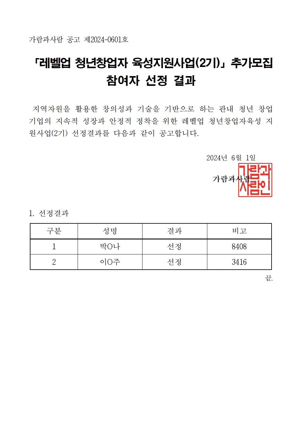 [가람과사람] 2024년 지역융합콘텐츠 청년창업지원사업 추가모집 8월 재공고 참여자 선정 결과 공고