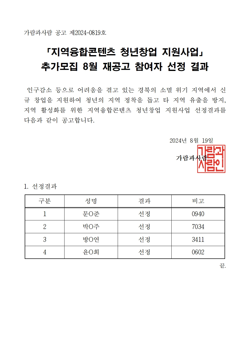 [가람과사람] 2024년 지역융합콘텐츠 청년창업지원사업 추가모집 8월 재공고 참여자 선정 결과 공고
