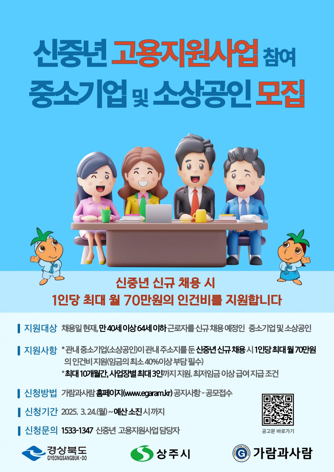 [가람과사람] 2025년 상주시 신중년 고용지원사업 참여 중소기업 및 소상공인 모집공고(~예산소진시) 관리자 0 1013 2025.03.24 09:26 2025.04.17 16:06 1. 공고문_2025년 신중년 고용지원사업 참여 중소기업 및 소상공인모집.hwp (186.5K) + 52 2025.03.24 09:32 2. 서식_2025년 신중년 고용지원사업 참여 중소기업 및 소상공인모집.hwp (80.0K) + 37 2025.03.27 10:39 신중년_서류 발급 방법 안내.hwp (58.0K) + 37