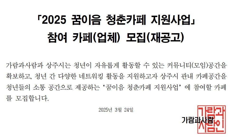 [가람과사람] 2025년 꿈이음 청춘카페 지원사업 참여카페 모집재공고 관리자 0 950 2025.04.08 09:30 2025.04.08 09:30 1. 공고문_2025년 「꿈이음 청춘카페 지원사업」 참여카페 모집재공고.hwp (113.5K) + 51 2025.04.08 09:30 2. 서식_2025년 「꿈이음 청춘카페 지원사업」 참여카페 모집.hwp (54.5K) + 33