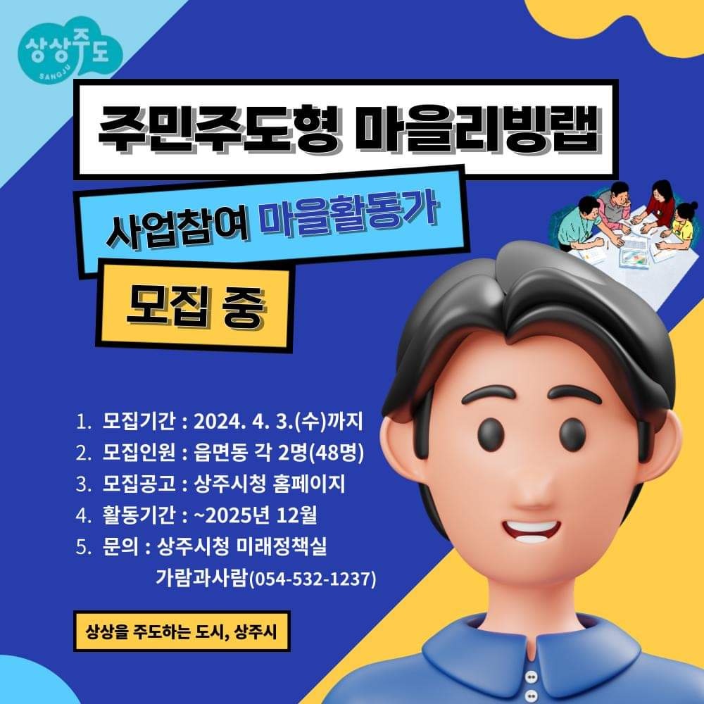 [가람과사람] 상주시 주민주도형 마을리빙랩사업 신청자 모집 공고 관리자 0 1907 2024.03.27 10:07 2024.03.27 10:07 상주시 주민주도형 마을리빙랩사업 신청자 모집 공고.hwp (63.5K) + 30 2024.03.27 10:07 주민주도형 마을리빙랩 모집_신청서.hwp (53.0K) + 24 마을활동 전문가 육성을 통한 마을경제 및 마을공동체 활성화를 위하여 상주시 주민주도형 마을리빙랩 사업의 신청자 모집을 아래와 같이 공고합니다. ○ 공고기간: 2024.3.19. ∼ 2024.4.3. ○ 모집인원: 48명(24팀*2명)○ 활동내용: 붙임 공고문 참조문의 : 054-532-1237