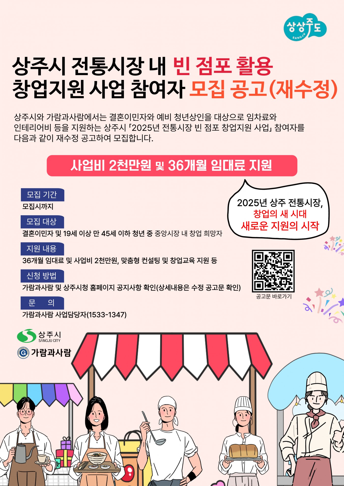 [가람과사람] 상주시 2025년 전통시장 빈 점포 창업지원 사업 참여자 모집 공고(재수정) 관리자 0 481 2025.11.10 11:47 2025.11.10 12:55 1. 공고문_상주시 2025년 전통시장 빈 점포 창업지원 사업 참여자 모집재수정.hwp (1.2M) + 33