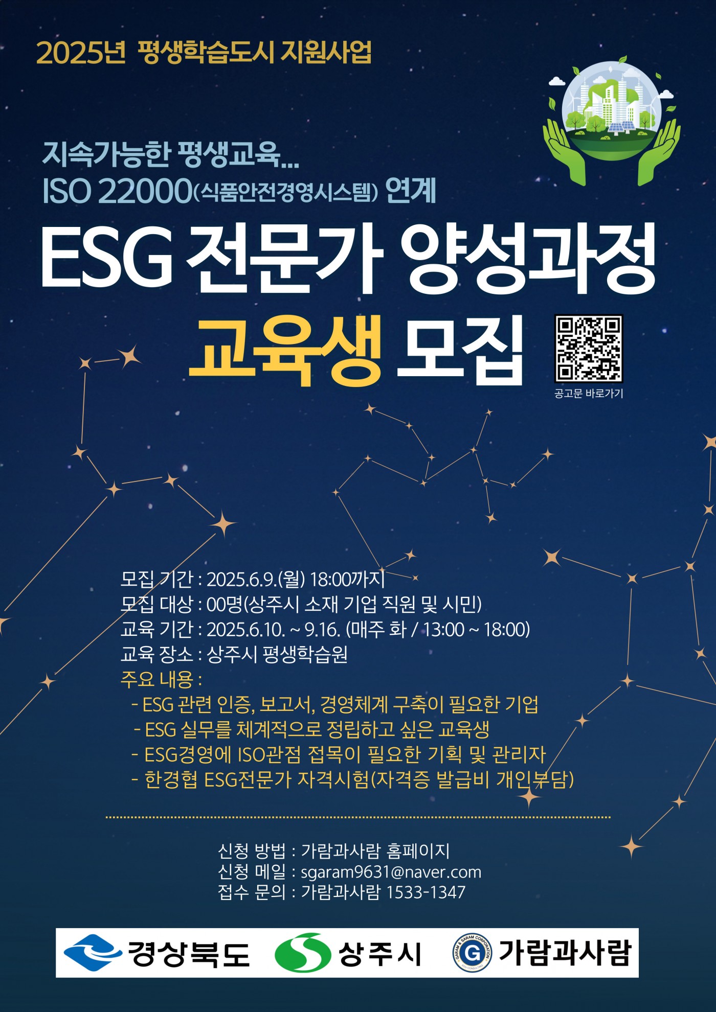 [가람과사람] 2025년 평생학습도시 지원사업 ISO 22000연계 ESG 전문가 양성과정 모집공고 관리자 0 639 2025.05.14 10:41 2025.05.29 13:54 ESG전문가 양성과정 교육생 모집 공고.hwp (108.5K) + 34