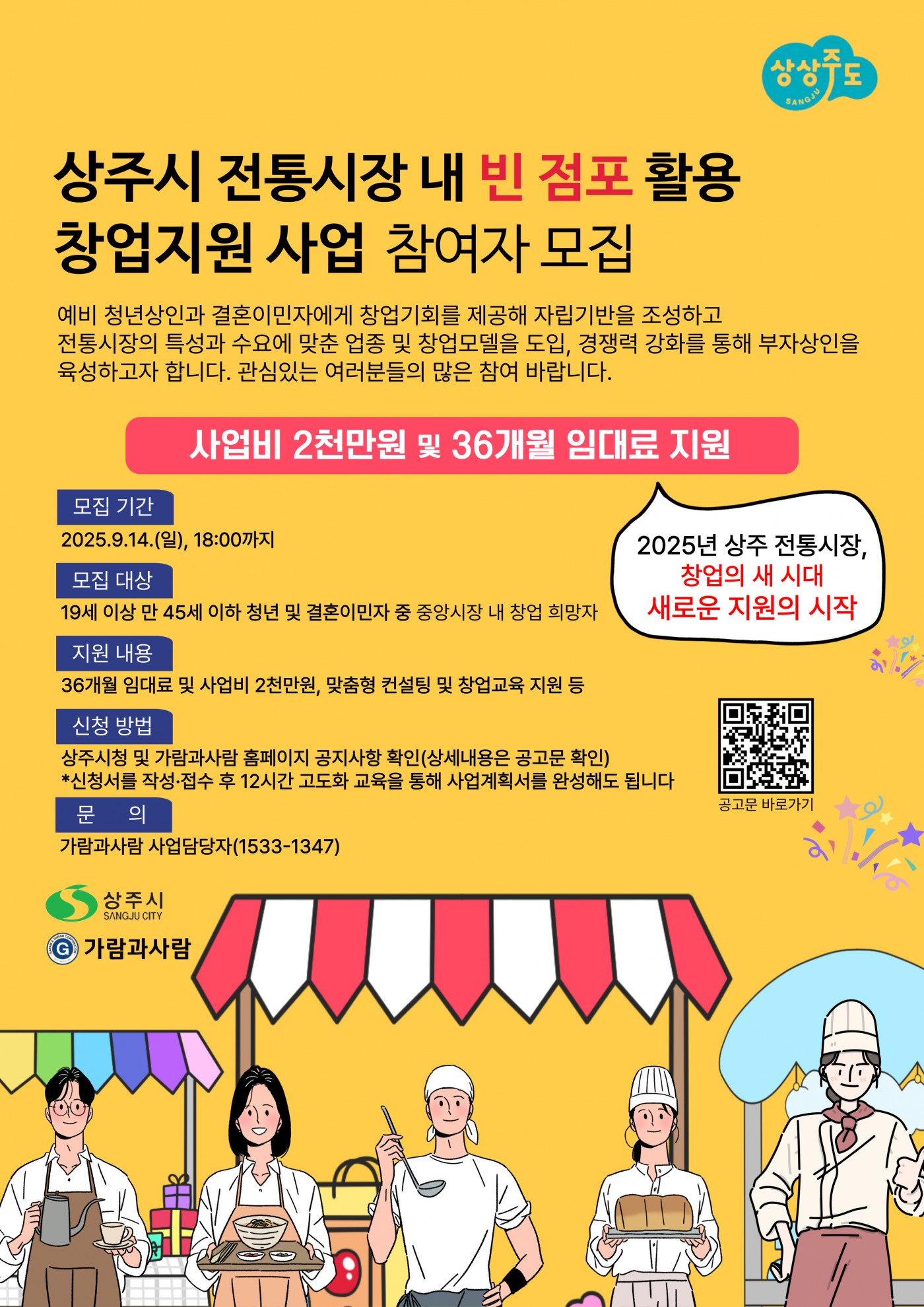 [가람과사람] 상주시 2025년 전통시장 빈 점포 창업지원 사업 참여자 모집 공고 관리자 0 709 2025.08.14 17:31 2025.09.08 15:47 1. 공고문_상주시 2025년 전통시장 빈 점포 창업지원 사업 참여자 모집.hwp (1.5M) + 66