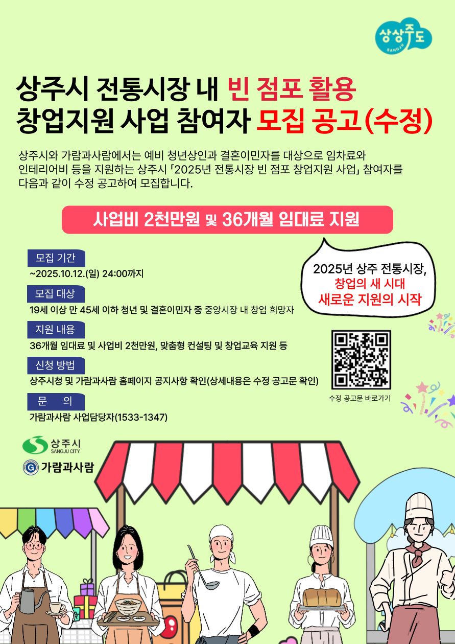 [가람과사람] 상주시 2025년 전통시장 빈 점포 창업지원 사업 참여자 모집 공고(수정) 관리자 0 472 2025.09.24 17:48 2025.09.25 10:15 1. 공고문_상주시 2025년 전통시장 빈 점포 창업지원 사업 참여자모집 공고수정.hwp (1.2M) + 29