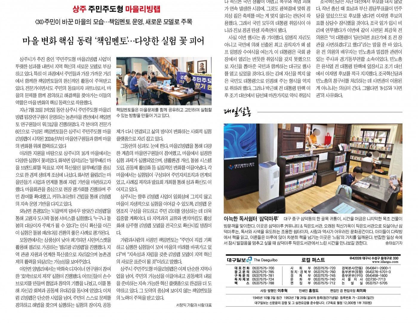 상주시가 추진 중인 ‘주민주도형 마을리빙랩 사업’이 뚜렷한 성과를 내면서 지역 혁신의 새로운 모델로 부상하고 있다. 특히 이 과정에서 주민들과 가장 가까운 거리에서 함께한 책임멘토들의 헌신적인 활동이 주목받고 있다. 전문가이면서도 주민의 동료이자 파트너로서, 마을의 문제를 함께 정의하고 해결책을 찾아가는 이들의 역할은 마을 변화의 핵심 동력으로 작용했다.