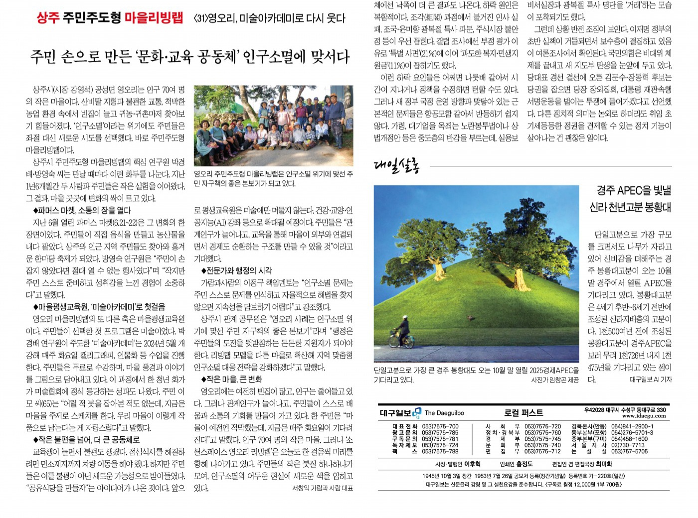 상주시 관계 공무원도 의견을 보탰다. 그는 “영오리 사례는 인구소멸 위기에 맞선 주민 자구책의 좋은 본보기”라며 “행정은 주민들의 도전을 뒷받침하는 든든한 지원자가 되어야 한다. 앞으로 이런 리빙랩 모델을 다른 마을로 확산해 지역 맞춤형 인구소멸 대응 전략을 강화하겠다”고 말했다.