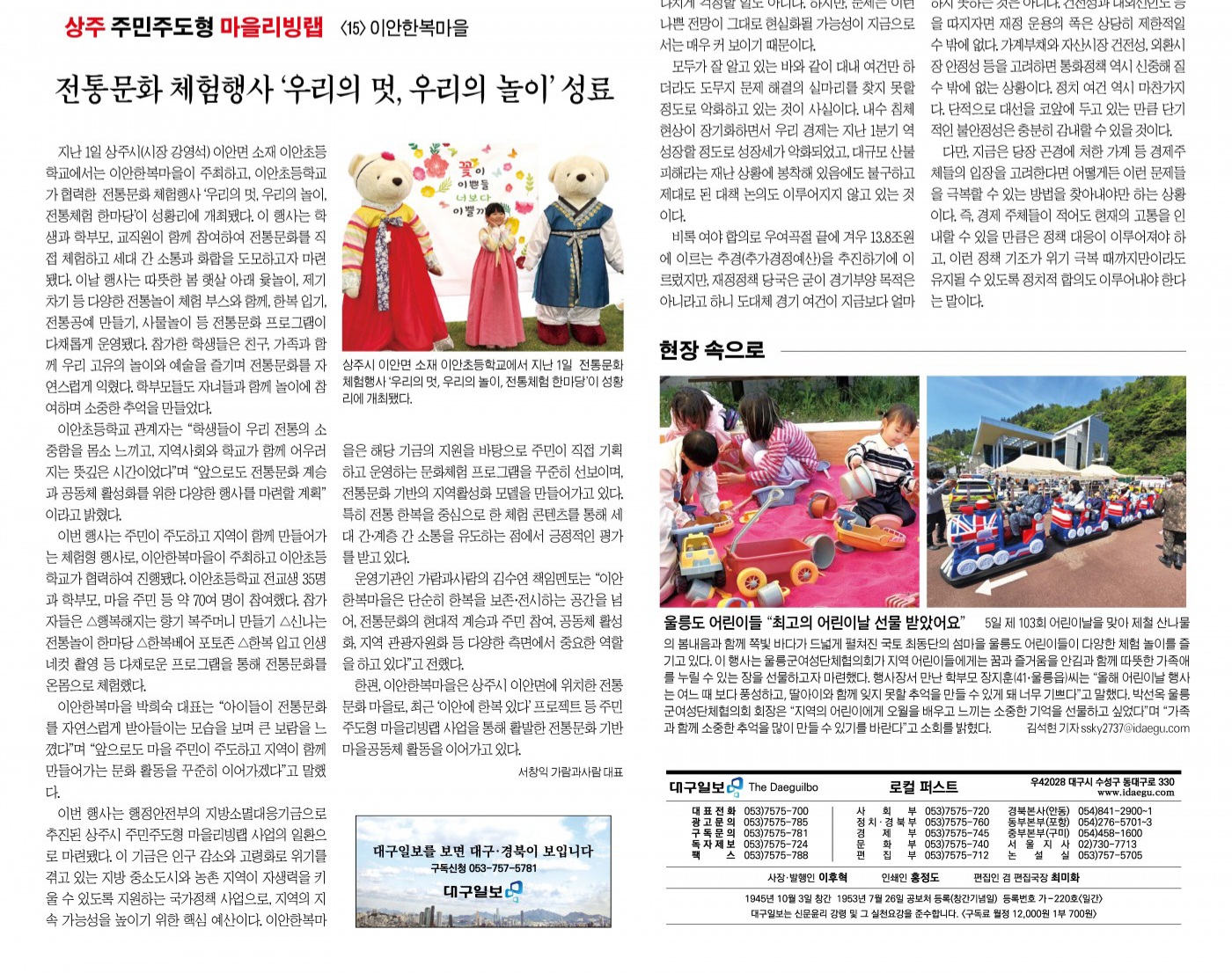 행복해지는 향기 복주머니 만들기 등 놀이와 체험을 통해 이안초교 학생들과 학부모 그리고 마을주민들은 상주시 이안에서 산다는데 긍지를 느끼며 행복한 날을 보냈다.