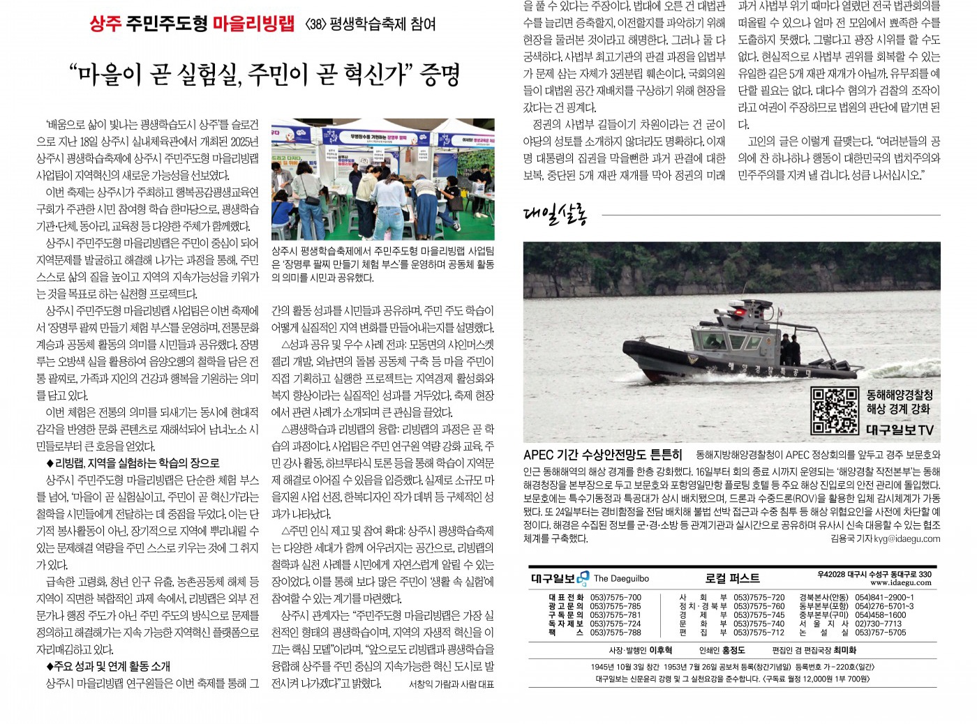 ‘배움으로 삶이 빛나는 평생학습도시 상주’를 슬로건으로 지난 18일 상주시 실내체육관에서 개최된 2025년 상주시 평생학습축제에 상주시 주민주도형 마을리빙랩 사업팀이 참여하여 지역혁신의 새로운 가능성을 선보였다.