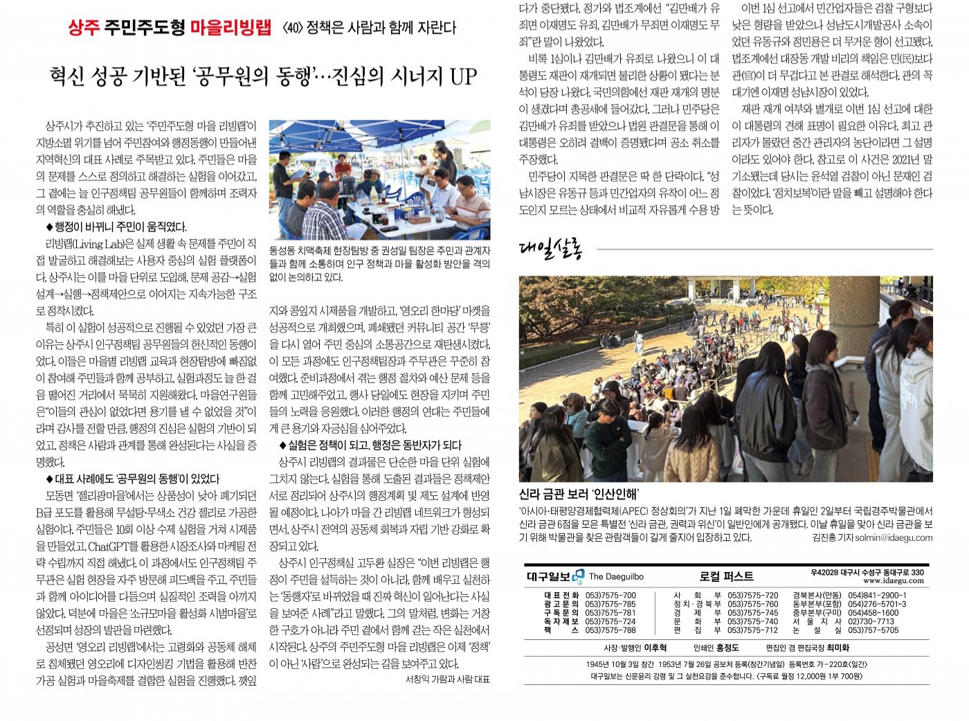 상주시 인구정책실 고두환 실장은 “이번 리빙랩은 행정이 주민을 설득하는 것이 아니라, 함께 배우고 실천하는 ‘동행자’로 바뀌었을 때 진짜 혁신이 일어난다는 사실을 보여준 사례”라며, “앞으로도 이러한 행정을 지속해가겠다”고 말했다. 그의 말처럼, 변화는 거창한 구호가 아니라 주민 곁에서 함께 걷는 작은 실천에서 시작된다. 상주의 주민주도형 마을 리빙랩은 이제 ‘정책’이 아닌 ‘사람’으로 완성되는 길을 보여주고 있다.