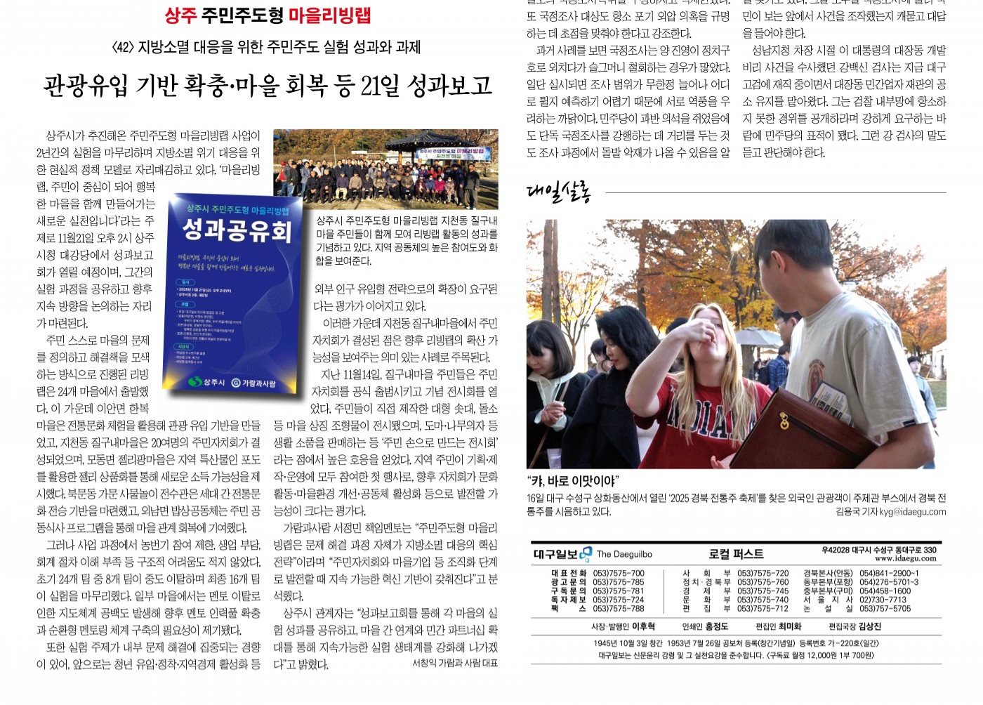 상주시 관계자는 “성과보고회를 통해 각 마을의 실험 성과를 공유하고, 마을 간 연계와 민간 파트너십 확대를 통해 지속가능한 실험 생태계를 강화해 나가겠다”고 밝혔다.