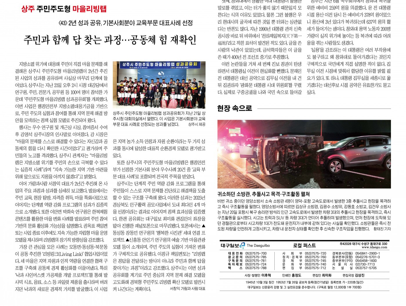 또한 상주시의 주민주도형 마을리빙랩은 행정안전부가 선정한 기본사회 분야 우수사례 20건 중 ‘교육 부문 대표 사례’로 포함되며 전국적 주목을 받았다.