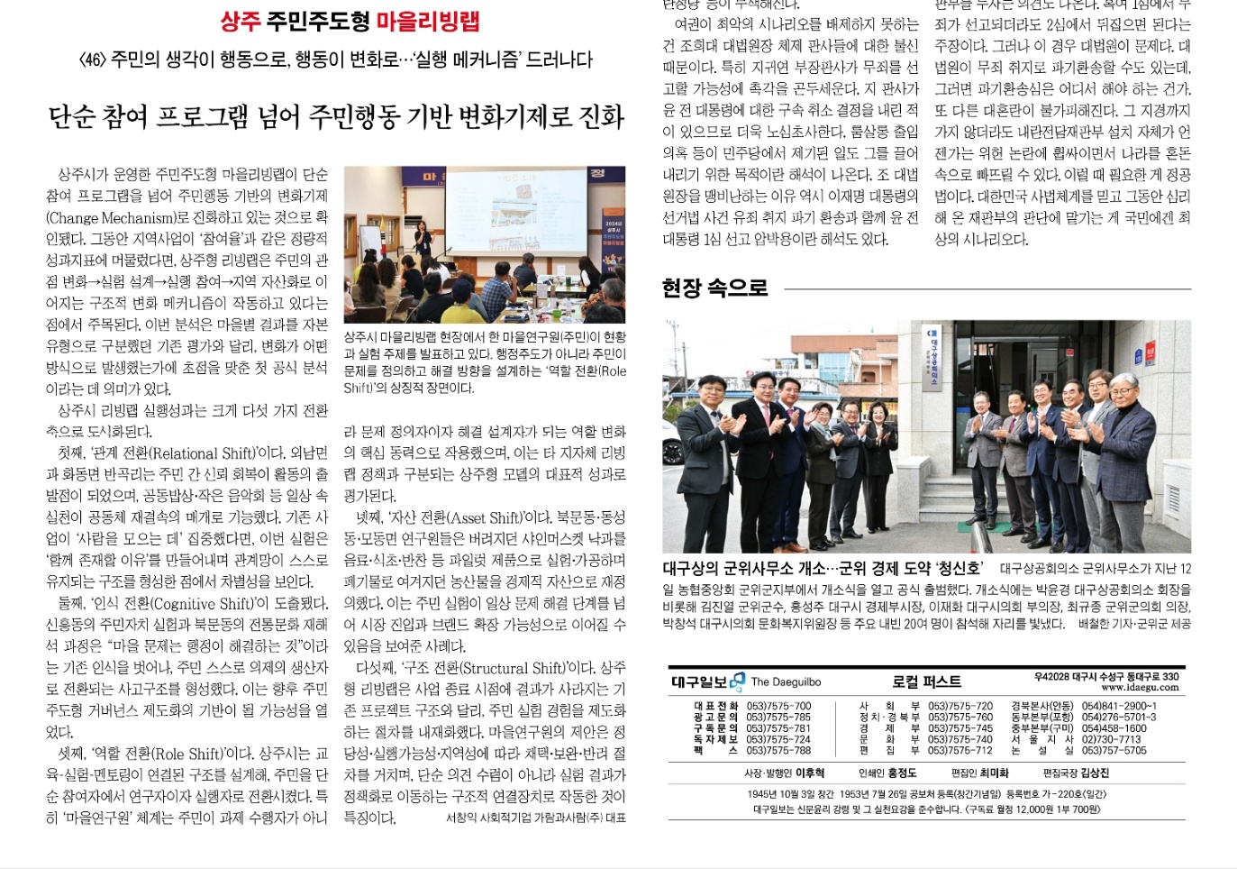 상주시가 운영한 주민주도형 마을리빙랩이 단순 참여 프로그램을 넘어 주민행동 기반의 변화기제(Change Mechanism)로 진화하고 있는 것으로 확인됐다. 그동안 지역사업이 ‘참여율’과 같은 정량적 성과지표에 머물렀다면, 상주형 리빙랩은 주민의 관점 변화→실험 설계→실행 참여→지역 자산화로 이어지는 구조적 변화 메커니즘이 작동하고 있다는 점에서 주목된다. 이번 분석은 마을별 결과를 자본 유형으로 구분했던 기존 평가와 달리, 변화가 어떤 방식으로 발생했는가에 초점을 맞춘 첫 공식 분석이라는 데 의미가 있다.